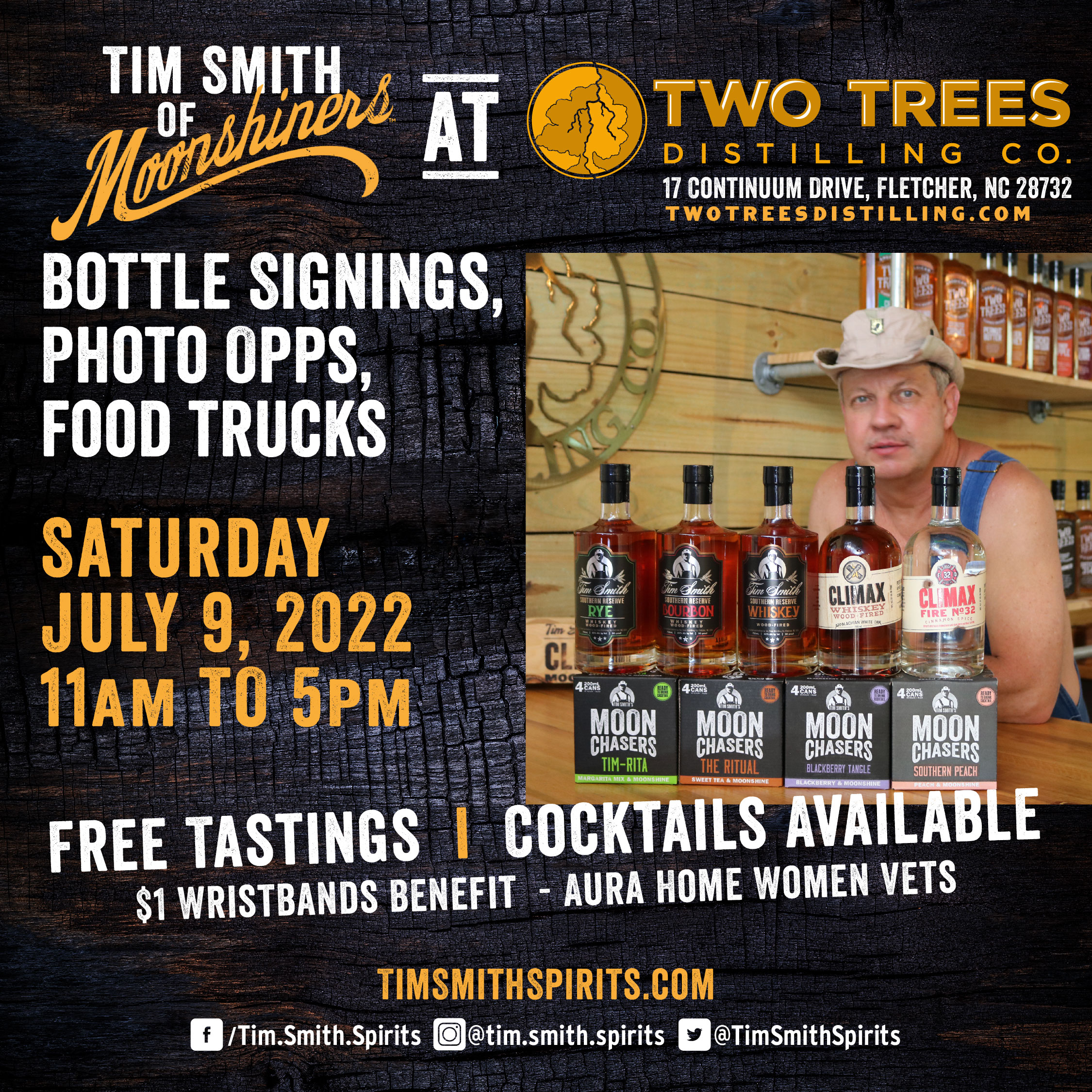 Tim Smith, the famous moonshiner from the Moonshiner’s TV Show on Discovery Plus, is coming to the Asheville North Carolina area! You may find him around town, at Harley of Asheville, and several other stops along the way, before they make it to Two Trees Distilling on Saturday June 3, 2023 for the main celebration.